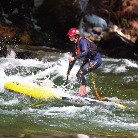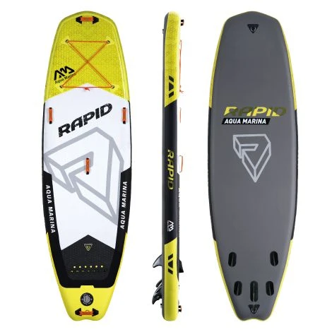 Het Aqua Marina Rapid SUP board is speciaal ontwikkeld voor suppen op wild of sterk stromen water. Dit maakt het Aqua Marina Rapid SUP board ideaal voor het varen in bijvoorbeeld de Ardennen of op een ruige zee. Door het korte ontwerp en de vijf vinnen is het Aqua Marina RapidSUP board zeer behendig en kunt u zo met een goede snelheid en volledige controle de rivier of zee bevaren. Met de GoPro bevestiging, voor op het SUP board, kunt u uw actieve vaart vastleggen. Voor de gevorderde SUP boarder is de Aqua Marina Rapid het ideale SUP board om sportief te zijn op het water. De Aqua Marina SUP board is door het korte ontwerp, in vergelijking met de andere Aqua Marina SUP boards, niet geschikt voor touren en ontspanning.