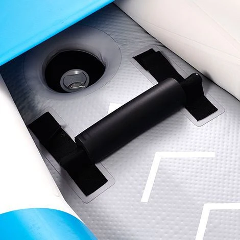 De voor- en achterkant van de kajak zijn voorzien van handvatten, zodat de kajak gemakkelijk vervoert kan worden. De kajak wordt naast de 2 vinnen en verstelbare zitting ook geleverd met een handmatige pomp en een handige draagtas om de kajak in te vervoeren. Er worden geen peddels bijgeleverd, maar deze zijn apart bij te bestellen. Ook is er een handige drybag te koop, waarin spullen zoals portemonnee of smartphone veilig in opgeborgen kunnen worden.