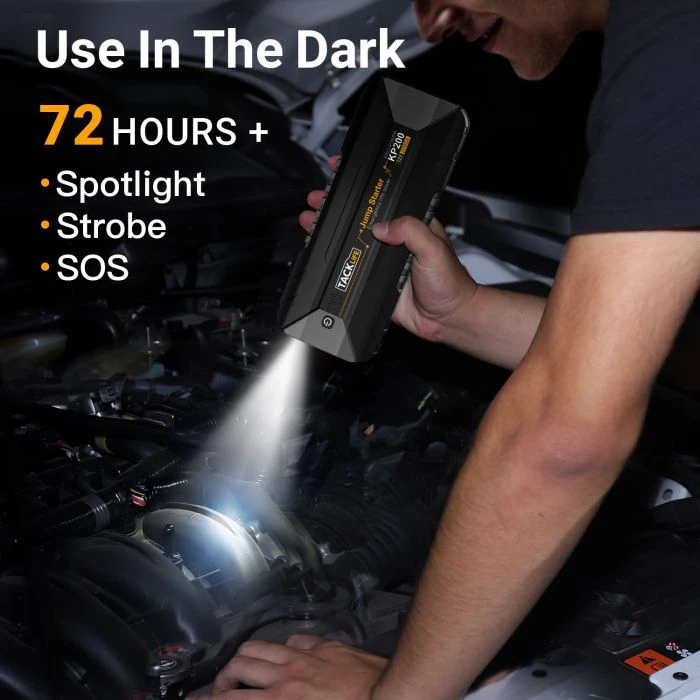 De Tacklife KP200 is zeer multifunctioneel, de startbooster is namelijk te gebruiken als powerbank voor verschillende auto accessoires, zoals luchtcompressoren om uw autobanden mee op te pompen. Ook kan de Tacklife KP200 gebruikt worden om smartphones mee op te laden. De USB Quick charge zorgt ervoor dat een smartphone al in 35 minuten van 0% naar 80% opgeladen is. Ook is de startbooster voorzien van een DC poort en zijn er nog 2 USB poorten aanwezig. De Tacklife KP200 is voorzien van LED verlichting die te gebruiken is in verschillende modes.
