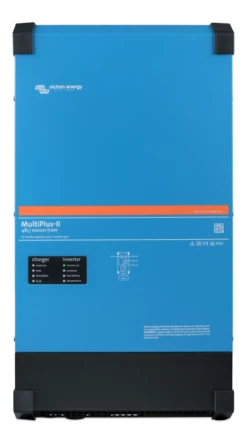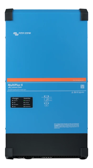 De Victron Multiplus II 48 10000 is een krachtige acculader en omvormer in één, hij is geschikt voor 48V loodaccu’s en lithium-ion accu’s. De Victron Multiplus II 48 10000 heeft een laadstroom van 140A en een piekvermogen van 18000W waardoor je gemakkelijk apparaten met een hoog startvermogen aan kan sluiten (Koelkasten, vrieskisten en airconditioners). Aan de onderzijde van de Victron Multiplus II 48 10000 zit een schakelaar waardoor het bedienen van de acculader en omvormer erg gemakkelijk is. Met deze schakelaar kunt en de Victron Multiplus 48 10000 aan- en uitzetten, maar ook kan je de keuze maken om alleen de acculader te gebruiken. De acculaders is 3-staps volautomatisch, deze drie stappen zijn: bulk, absorptie en float. De stappen worden ingezet op basis van jouw accu gebruik. Hierdoor word jouw accu op de juiste manier opgeladen, je behoudt hiermee een betere conditie voor jouw accu.